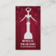 A silhouette of a corkscrew opening a bottle of wine is dominant on this merlot colored striped business card. Grapevines adorn the edges with the business name and main contact information under the cropped bottle. Add a name and title along with extra information on the reverse. Perfect for a wine shop or any liquor store, a sommelier or any wine connoisseur. Available with matching products.