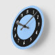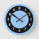 This is a very simple clean design for those that enjoy the uncluttered look. Features cornflower blue and black circles within each other, with the blue circle on the inside, and an outer rim. The clock has white numerals.