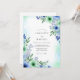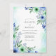 This design features a delicate wash of watercolor florals in shades of cornflower blue and soft mint green. Elegant sprigs of lilac and petite blossoms create a serene, airy atmosphere perfect for a seasonal event. The ethereal palette is grounded by lush verdant foliage and soft teal accents against a crisp white backdrop.