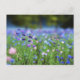 A field of cornflowers in shades of deep and pale blue, purple, lavender, and pink, with pale green leaves.