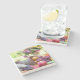 A stone coaster with a photograph of a table filled with natures bounty. Set with cornucopia, colorful harvest vegetables and fruits.