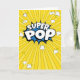 Fun little popped popcorn, hand drawn, illustrations on a shades of yellow, ray burst background, with Super Pop in a playful font on a colorful, bright, comic book pop art bursting splash and little stars in yellow. On the inside a blank canvas to make it your own special design with a bright yellow background with popcorn on the back.