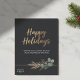 An upscale, professional holiday card designed for modern businesses. This minimalist, elegant card features a matte black/charcoal background for maximum contrast. The greeting, “Happy Holidays” is rendered in a beautiful faux gold script calligraphy, adding a premium touch without excessive shine.