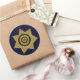 Correctional Officer Gold Badge STICKER is a graphic art design. The badge is created in gold and black with a small touch of blue. A decorative seven (7) point gold star forms the badge. Text curving the top of the badge reads: DEPARTMENT OF CORRECTIONS. Text curving the bottom reads: CORRECTIONAL OFFICER. These words sit on a solid black ring. More gold decorates the badge throughout. An eagle emblem with gold stars sits in the center. Smaller text in the center reads: Seal of the State. The badge is not state specific. Under the gold badge is a solid blue background.