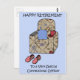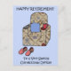 A comfy looking, chintz patterned armchair with a TV remote control on one arm of the chair and a mug on the other. The words 'Happy Retirement to a special correctional officer' accompany the image.