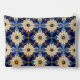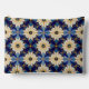 A symmetrical floral pattern features prominently, with white petals outlined in gold against a deep blue and light blue background. The design radiates elegance and intricacy, creating a visually striking motif.