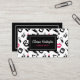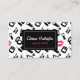 Business card in black, white, and pink featuring a pattern of cosmetic products like lipstick, nail polish, foundation, eye shadow, mascara, and more. A chic and professional card for a makeup artist or beauty salon owner.