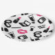 Paper plates in black, white, and pink featuring a pattern of cosmetic products like lipstick, nail polish, foundation, eye shadow, mascara, and more.