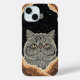 Peeking through an asteroid window, a grumpy yet lovable cosmic cat gazes into the vastness of space. This fun, retro-style illustration combines a love for felines with the adventure of space travel, perfect for any cat lover with their head in the stars.