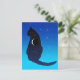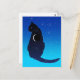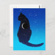 Postcard in a silhouette of an elegant sitting cat patterned with a starry sky and crescent moon on an evening blue, starry background