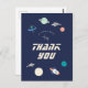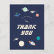 An outer spaced themed thank you postcard with cute illustration of planets, shooting stars, alien, spaceship, and space shuttle all orbiting out of this world. This postcard is part of the Cosmic Celebration birthday party collection available by Lisa McLean Design. I hope you like it.