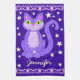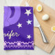 A smiling purple kitty cat with green eyes, lots of lucky stars, midnight blue kitchen towels with pink trim, pale yellow lettering. You can personalize these tea towels by replacing the current text in the text box (ie Jennifer) with your name or desired text. Use the customize feature to change font size, color or style if desired. Have a happy day!