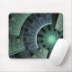 Mouse pad with "Cosmic Pod", abstract art, copyright © 2008, Susan Wallace. A circular labyrinthine pattern in shades of green and blue, combining geometric shapes in a complex futuristic design.