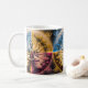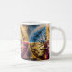 his cosmic sacred geometry god mandala mug features a multi armed divine figure seated in deep meditation, surrounded by intricate swirling patterns that radiate light and energy in every direction. The design blends gold, blue, and magenta color quadrants to symbolize balance of the four elements, spiritual awakening, and universal consciousness, making it perfect for yoga lovers, mystics, and seekers