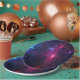 Paper plates with a blue, pink and black fantasy image of cosmic space with stars and wispy nebula.