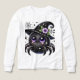A fluffy black spider with a starry witch hat, purple eyes and a floral accent. Whimsical Halloween charm for kids and fantasy lovers, ideal on tees and bags.