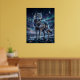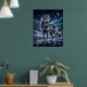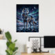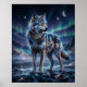 A majestic cosmic wolf stands proudly on a frozen celestial ridge, its body formed from glowing nebula clouds, shimmering star clusters, and deep space textures. Radiant eyes shine like distant stars, while its fur flows with subtle constellations and luminous energy. Set within a surreal cosmic tundra of icy terrain, distant planets, and aurora-lit skies, this artwork captures the spirit of a powerful interstellar predator. Perfect for modern wall art, sci-fi decor, and fantasy lovers seeking a bold, atmospheric centerpiece.