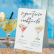 This sophisticated signature cocktails menu table tent sign features simple black typography above 2 of your favorite drinks and their ingredients for your coastal wedding bar. A chic Cosmopolitan and Lemon Drop drawing add a fun flair to your bar menu. Complete with the couple's names and date for their reception.
