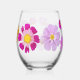 Stemless wine glass featuring cosmos flowers in pink, white, and orange.