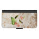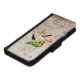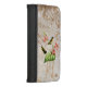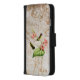 Monogrammed wallet case with two green and gold hummingbirds perch on a tropical plant with pink flowers, on an off-white vintage grunge background with gold swirls and floral silhouettes.