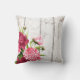 Stylish accent throw pillow done in a white washed distressed wood fence looking background, with vintage graphics of pink peony flowers, in the left bottom corner. Lovely decorator touch for any room of the house.