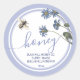 Blue composite flowers with a pretty blue border and vintage queen bee. Honey is written in a decorative font. Add your Apiary name and contact info with net weight.