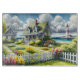 A dreamy coastal cottagecore landscape filled with soft watercolor charm and breezy seaside tranquility. A welcoming seaside cottage sits among lush garden paths, blooming flowers, and a bright white picket fence, creating a warm storybook atmosphere. In the distance, a tall lighthouse rises beside sparkling blue ocean waves, adding a classic nautical touch to this peaceful coastal setting. Fluffy clouds drift across a vibrant sky while sunlight washes over pastel florals, green lawns, and cheerful garden beds. The gentle brushstroke style gives the scene a whimsical, painterly feel reminiscent of cozy coastal living, cottage gardens, and relaxed seaside afternoons. Fresh spring colors, airy ocean blues, and soft floral pinks blend beautifully to create an enchanting cottagecore aesthetic that feels calm, nostalgic, and full of coastal charm. AI generated artwork.
