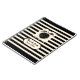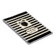 Bold black striped design framing a black woodcut apple in the cottagecore aesthetic on a cream background. Create your own notebook for recipes or secrets from your kitchen.