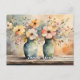 Two bouquets of flowers, side by side on a shelf, in earthenware vases are the perfect way to say "thank you" on this country style postcard.