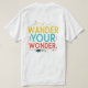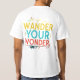 The t-shirt features the phrase "Wander Your Wonder" in a vibrant multicolor display. Each word is a different color, creating a sense of joyful exploration. The design itself is simple and uncluttered, letting the multicolored text take center stage. This is a perfect t-shirt for anyone who embraces adventure and the pursuit of their own unique curiosity.