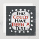 A cute typographic design that says "This Could Have Been A Text". It's black and red text on a white rectangle with funky, playful white dots surrounding it, all on a gray background.