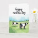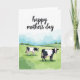 This card features a calm countryside scene with a sweet Mother’s Day greeting at the top. Across the upper area, the words “happy mother’s day” appear in dark lettering on a white background, standing out clearly and leaving plenty of open space around the text. Below, two black-and-white cows anchor the scene, with the larger one in the front right and the smaller one set back on the left. Their relaxed stances and the gentle way the nearer cow seems to watch over the other suggest a caring bond ❤️. The pasture rolls in soft layers of fresh green, with the animals grazing as if sharing a quiet moment together. Along the horizon sits a row of rounded trees in muted green tones, adding a cozy, sheltered feel 🌼. Above them, the sky is washed in pale blue with soft white clouds drifting across.