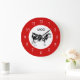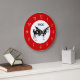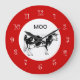 Cute country cow kitchen wall clocks with image of a black and white vector cow on the clock face in this decorative wall decor clock design for your kitchen, bathroom, or any room in your house you want to add some character and style. Colors include red, black, and white.