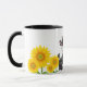 This ceramic coffee mug is shown with a cute country cow and sunflowers art print.