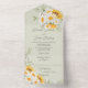 This All-in-One Wedding Invitation features cheerful collections of daisies and sunflowers on a soft sage green background. It's the perfect choice to make your wedding day a work of art. The All-in-One wedding invitations are both beautiful and practical by combining the wedding invitation with an easy to remove perforated RSVP postcard. They are also quick and easy to prepare for mailing. Simply address the invitation, fold the back flap and seal with the included clear stickers. Once your guests receive the pre-addressed invitation they simply tear off the perforated RSVP card and drop it in the mail.