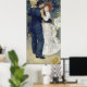 Country Dance by Pierre-Auguste Renoir, oil on canvas 1883, is a painting of a French couple dancing closely and exuberantly on a dance floor. The man wears a dark blue, formal suit, while the woman smiles brightly in a long white patterned dressed daintily clasping a fan in her raised hand. Renoir captures the warmth, human empathy, and painterly realism of a fleeting moment in time in rapidly applied brush strokes in a tall, vertical composition.