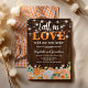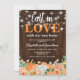 Country fall house-warming party invitation featuring a rustic wood background, backyard string lights, elegant autumn orange and white garden watercolor flowers, the cute saying "fall in love with our new home", and a new home party template that is easy to personalize.