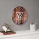 Dark brown barn wood planks print clock with white roman numerals and tick marks for hours and minutes plus your personalized monogram letter and full family name in white.