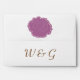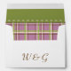 Bring touch of country charm to your event with custom envelopes featuring a wisteria purple rose with a stitch-like border on the front at the bottom right, a matching purple rose on the back flap, and initials that you can change to match your own on the back underneath. A final dash of cozy allure can be found on the inside with a wisteria, sage green, buttermilk beige, and coffee plaid pattern covering the interior with a green accent panel that appears to be stitched on at the top on the flap, giving a wonderful homemade touch to frame your invitation. Be sure to check out the full Country Garden Wedding collection to find more products, including invitations, guest books, return address labels, and even favor boxes, with matching designs that will allow for a truly coordinated wedding or special event.