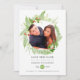 Green and white wedding save the date photo cards featuring ferns, wildflowers and strawberries and a sage green watercolor wash background.