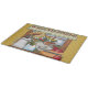 Perfect for a country kitchen, this cutting board features window scene with rooster, sunflowers and apples with gold background.