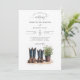 A charming watercolor illustration of two pairs of country western boots—his and hers—paired with a rustic pot of wildflowers beautifully decorates this invitation. Perfect for a country, barn, or rustic wedding theme, this design captures the warmth and simplicity of a Western celebration, setting the tone for an unforgettable day in the countryside.