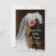Thank the guests attending your ranch theme bridal shower or marriage reception for their gifts with the charming Country Rose and Cowboy Boots Wedding Flat Thank You Note. These casual yet classy custom rustic western thank you notes feature a quaint floral photograph of a pair of brown leather cowboy boots filled with a pink rose flower blossom with a bridal veil and barn wood on white satin. Perfect for after your informal farm style barn party celebration event.