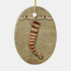 this cute stocking ornament is perfect for the country christmas with an old fashion stocking on a burlap background being hung by popcorn wreath