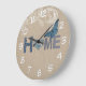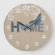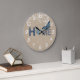 Patchwork letters with blue and white floral heart spell out Home in this pretty country style design on a rustic burlap effect linen background. Added details of a blue butterfly and white floral scroll pattern. Designed by Lark Designs