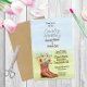 A lovely watercolor background in blue and green with a cowboy boot filled with Sunflowers - a true country wedding invitation.