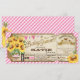 Country picnic inspired with sunflower bouquet in mason jar wrapped in burlap and lace and tied with twine over pink gingham check rustic baby shower invitation card.