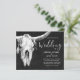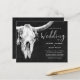 Invite your guests to your special day with these black and white country western farmhouse rodeo bull skull wedding invitations. Rustic texture background to customize your information on. Image copyright Marg Seregelyi Photography.