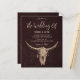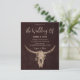 Invite your guests to your special day with these brown country western farmhouse rodeo bull skull vertical budget wedding invitations. Beautiful rustic texture background to customize your information on. Image copyright Marg Seregelyi Photography.