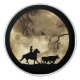 A cowboy rides under the moonlight, rounding up the last of his cattle on horseback.